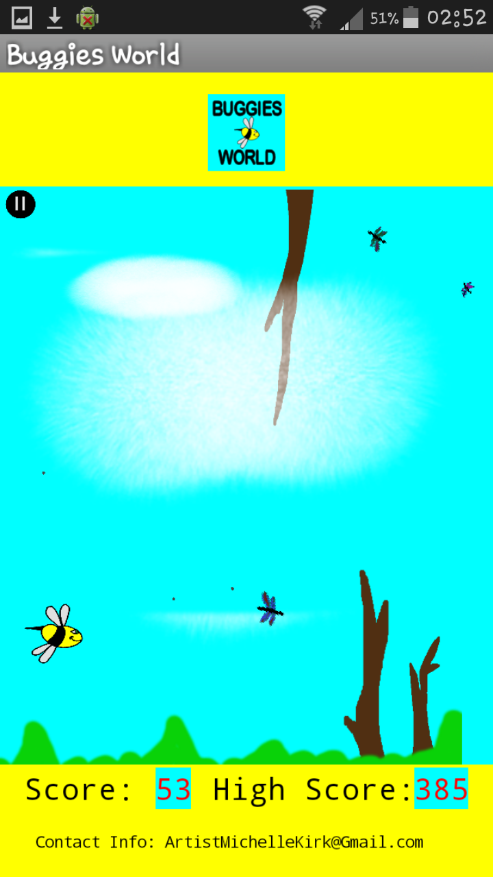 This is an easy to play game, that is good for any age. Simply select from one of three players, then press the start button. Tap the screen to go up, or stop tapping to go down. Avoid obstacles or the game will end. High score wins. Enjoy playing Buggies World! | ||