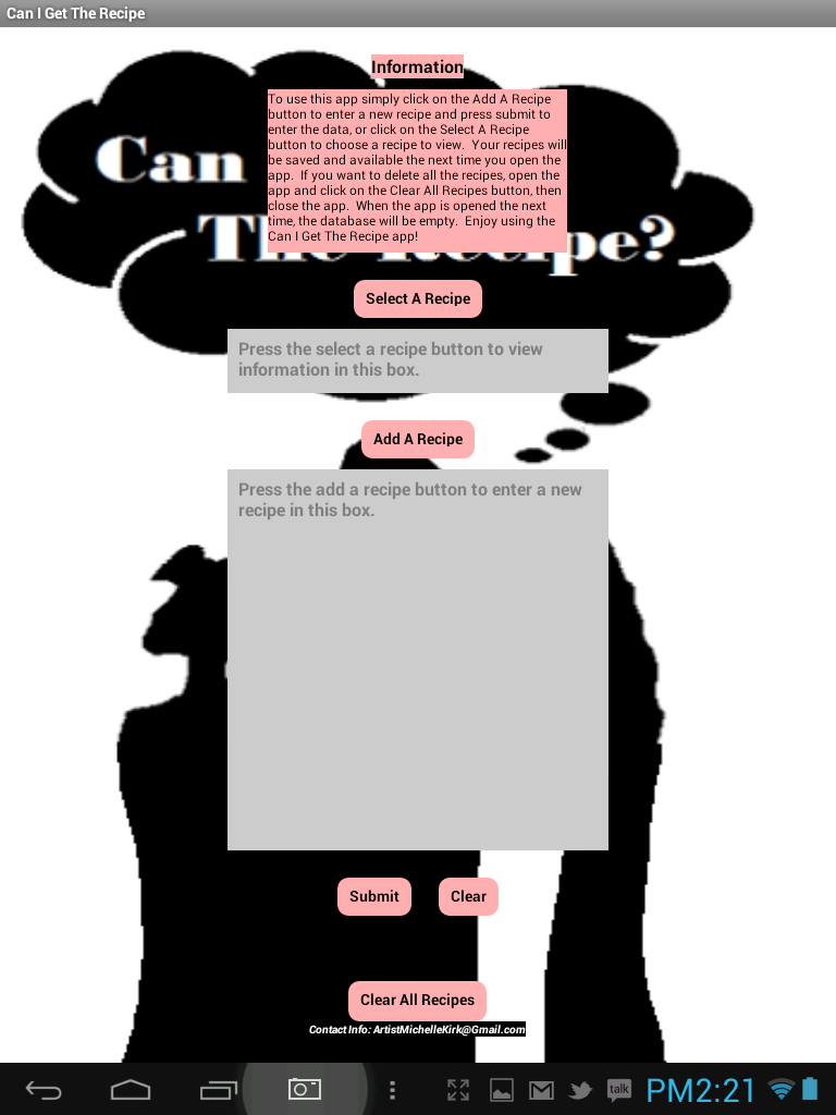 You can add your own recipes to take along to a family or friend gathering, or ask someone for a recipe you like while there. Take this along with you during your travels, or when being out on the town. I am working on additional features that will allow the user to update and change or delete individual recipes. This app contains no recipes. |