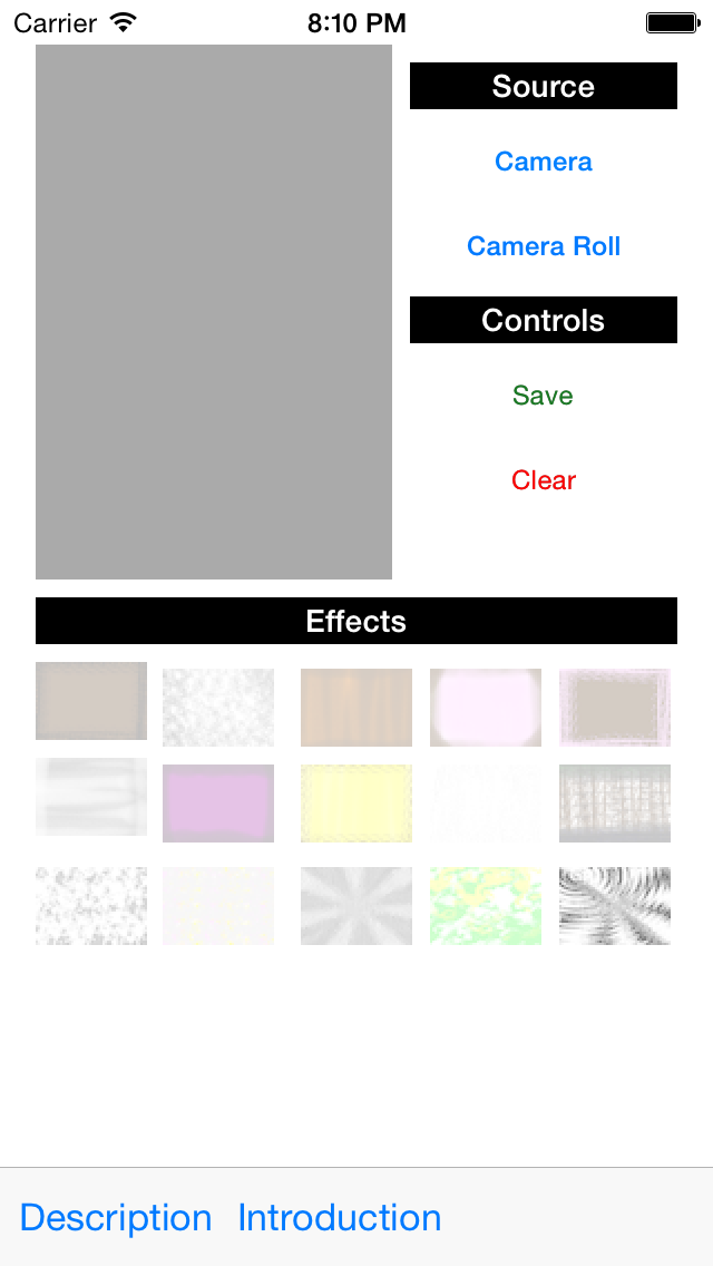 This app features: - the ability to use an image from your camera or photo gallery - a selection of a number of filter effects to add to your photo - a save feature