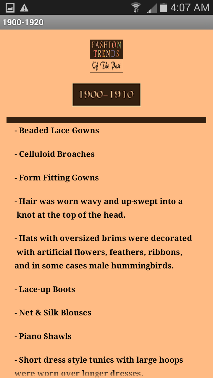 This app was developed to be useful for a quick reference for what was in fashion in the past and worn by both females and males in the USA. It includes a minimum of ten fashion trends for each decade listed below. 1900-1910 | 1910-1920 | 1920-1930 | 1930-1940 1940-1950 | 1950-1960 | 1960-1970 | 1970-1980 1990-2000 While there are many fashion trends, I have selected those that define what was the most popular at the time. This app is a good reference for those who work in the entertainment industry, especially for those who are background artists, as well as those looking to assemble a costume, for educational purposes, and more. Enjoy using Fashion Trends Of The Past! |