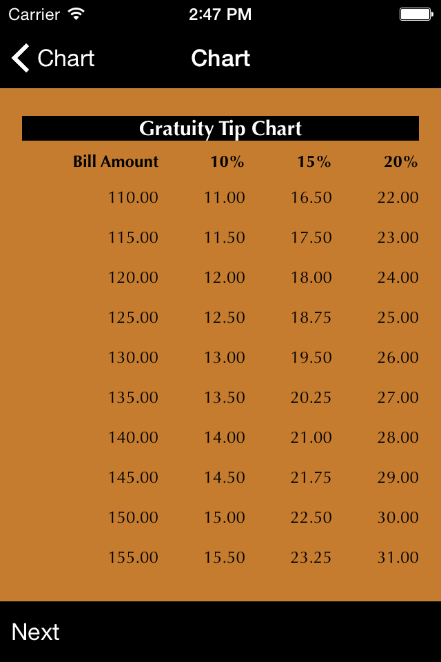 This app provides a chart for the estimation of how much gratuity to pay for services based on a percentage of the bill. - amounts up to $505 - percentages include 10%, 15%, 20% Enjoy using the Gratuity Tip Chart app! |