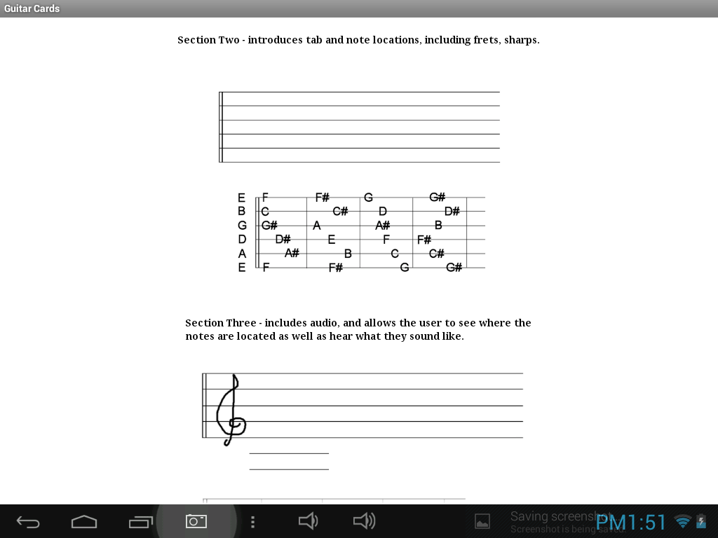 This app contains over twenty-five instructional and educational cards that teach the basics of guitar, tab, staff, and note location. This app can be useful for students, teachers, beginning guitar players, as well as guitarists that may already play the guitar, but are looking to learn how to read or write music. | ||