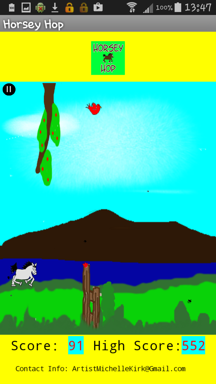 This is an easy to play game, that is good for any age. Simply select from one of three players, then press the start button. Tap the screen to go up, or stop tapping to go down. Avoid obstacles or the game will end. High score wins. Enjoy playing Horsey Hop! | ||