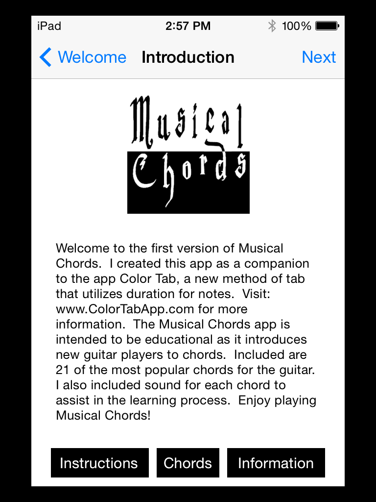 This is the second version 2.1 of Musical Chords. This app is good for those who can utilize a mobile version of popular chords for easy reference. Guitarists, music teachers, and students, may find this app useful. This app is intended to be educational as it introduces new guitar players to chords. Included are some of the most popular chords for the guitar. I also included sound for each chord to assist in the learning process. | ||