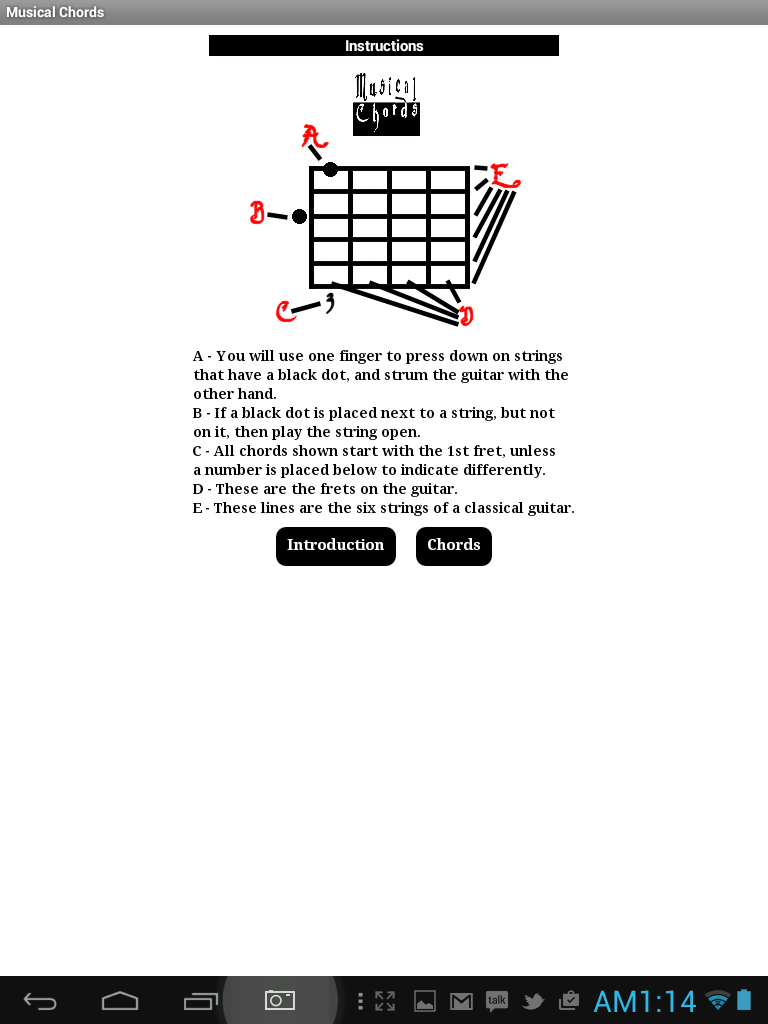 This app is good for those who can utilize a mobile version of popular chords for easy reference. Guitarists, music teachers, and students, may find this app useful. This app is intended to be educational as it introduces new guitar players to chords. Included are some of the most popular chords for the guitar. I also included sound for each chord to assist in the learning process. | ||