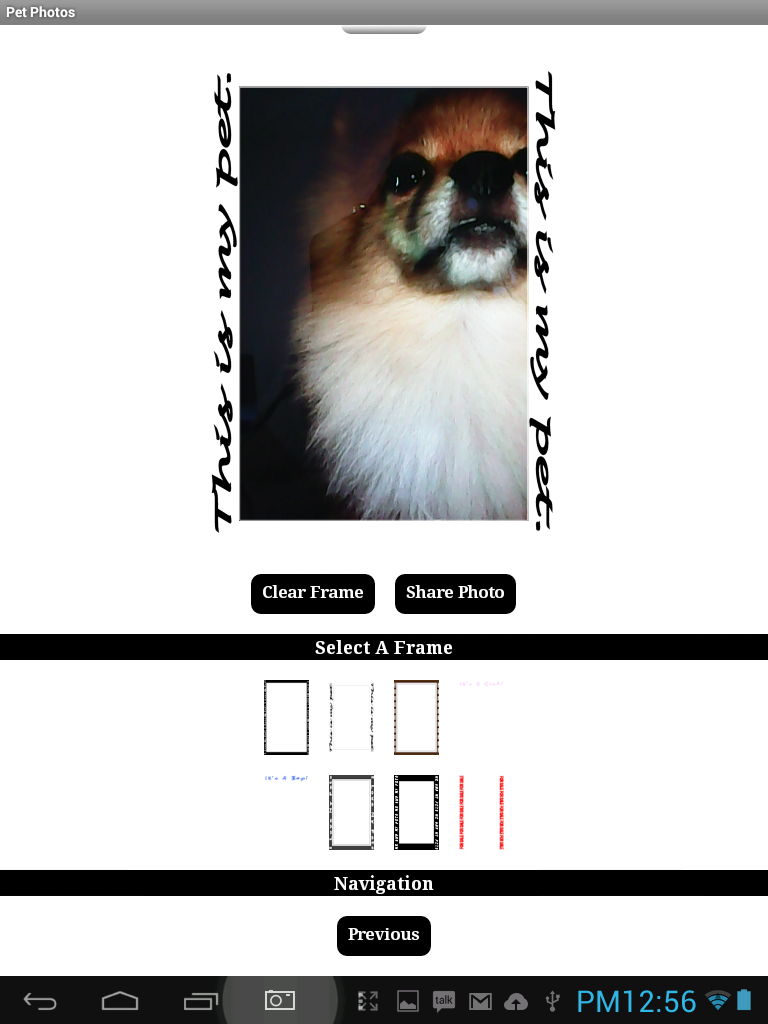 As an pet owner myself, I am always taking pictures of my pets. This app has several themed frames to select from to place around an image you take with your device. I have setup this app to fit within the area of a cell phone or tablet. You can take a landscape or portrait photo. After you take a photo and add a frame, you can share it on the web by email or through social media. Enjoy using the Pet Photos app! |
