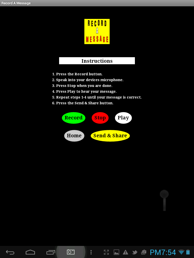 Simply record your message, then send to whomever you like using the features available in your device. Enjoy using Record A Message! | ||
