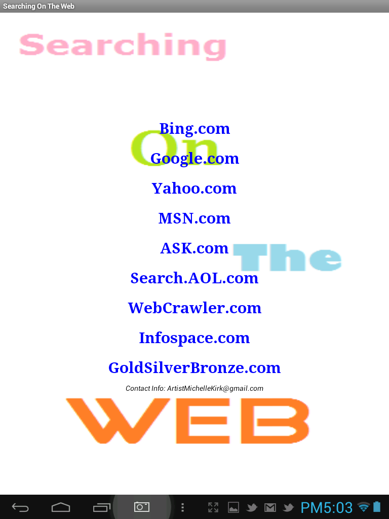 Users can simply click on one search engine, enter their topic, then return to the main area and select a different search engine if they were not able to locate their desired topic. The search engines selected to be included within this app was done so at random, and once displayed on the screen any information contained on their pages is not controlled by the developer of this app. | ||