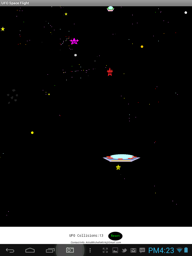 This game is easy to play. To move the UFO around the screen simply tilt your device. Watch where you fly as every time your ship comes into contact or crosses paths with an meteor, asteroid, or other flying object, a marker is made in space and your number of collisions increases. The goal is to have a safe flight and watch where other objects in space have crossed paths. Time yourself, record your number of collisions, then challenge friends. The person with the lowest number of collisions wins! | ||
